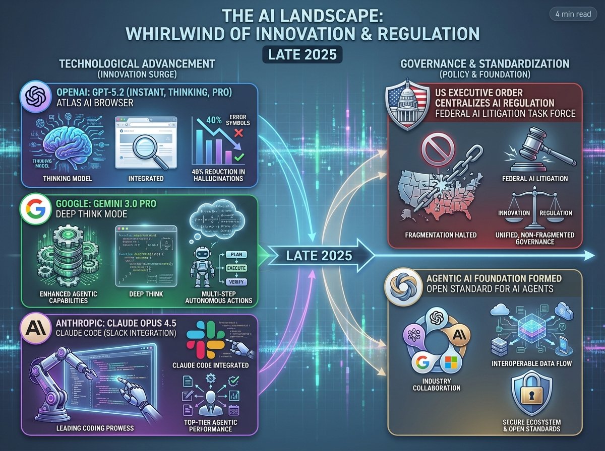 Late 2025 AI landscape: OpenAI, Google, Anthropic released major new models. US government enacted key AI regulations. A...